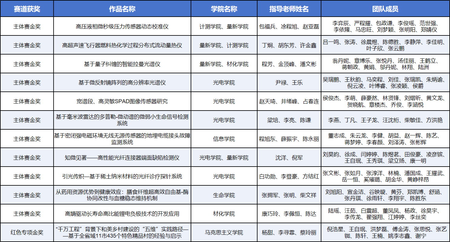 本次比賽中,學校在主體賽中榮獲金獎11項、銀獎10項、銅獎3項;紅色專項賽中獲金獎1項、銀獎3項、銅獎1項。其中,主體賽作品《高壓液相微秒級壓力傳感器動態校準儀》入圍本屆大賽優秀作品公開答辯展示(全省僅13件作品)。