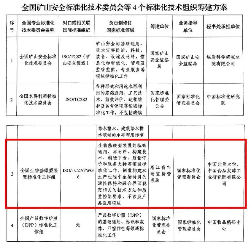 近日,國(guó)家標(biāo)準(zhǔn)化管理委員會(huì)正式批復(fù),同意籌建“全國(guó)生物基微型裝置標(biāo)準(zhǔn)化工作組”。該工作組由中國(guó)計(jì)量大學(xué)為第一單位申請(qǐng)、浙江省市場(chǎng)監(jiān)督管理局推薦,秘書處由我校與中國(guó)食品發(fā)酵工業(yè)研究院有限公司聯(lián)合承擔(dān),浙江省市場(chǎng)監(jiān)督管理局作為籌建單位共同推動(dòng)相關(guān)工作的組織開展。
