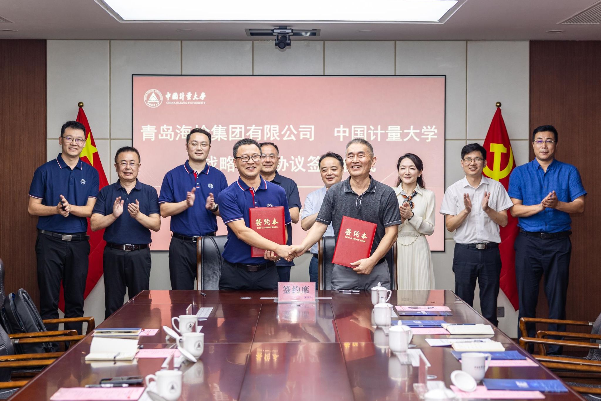 青島海上綜合試驗場有限公司總經理石鵬與中國計量大學教育部原位計量重點實驗室主任王月兵在雙方領導見證下簽署戰略合作協議。